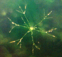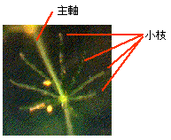 シャジクモ亜科の小枝(主軸から放射状に輪生しているもの)は分枝しませんが、フラスコモ亜科の小枝は1〜数回分枝します。